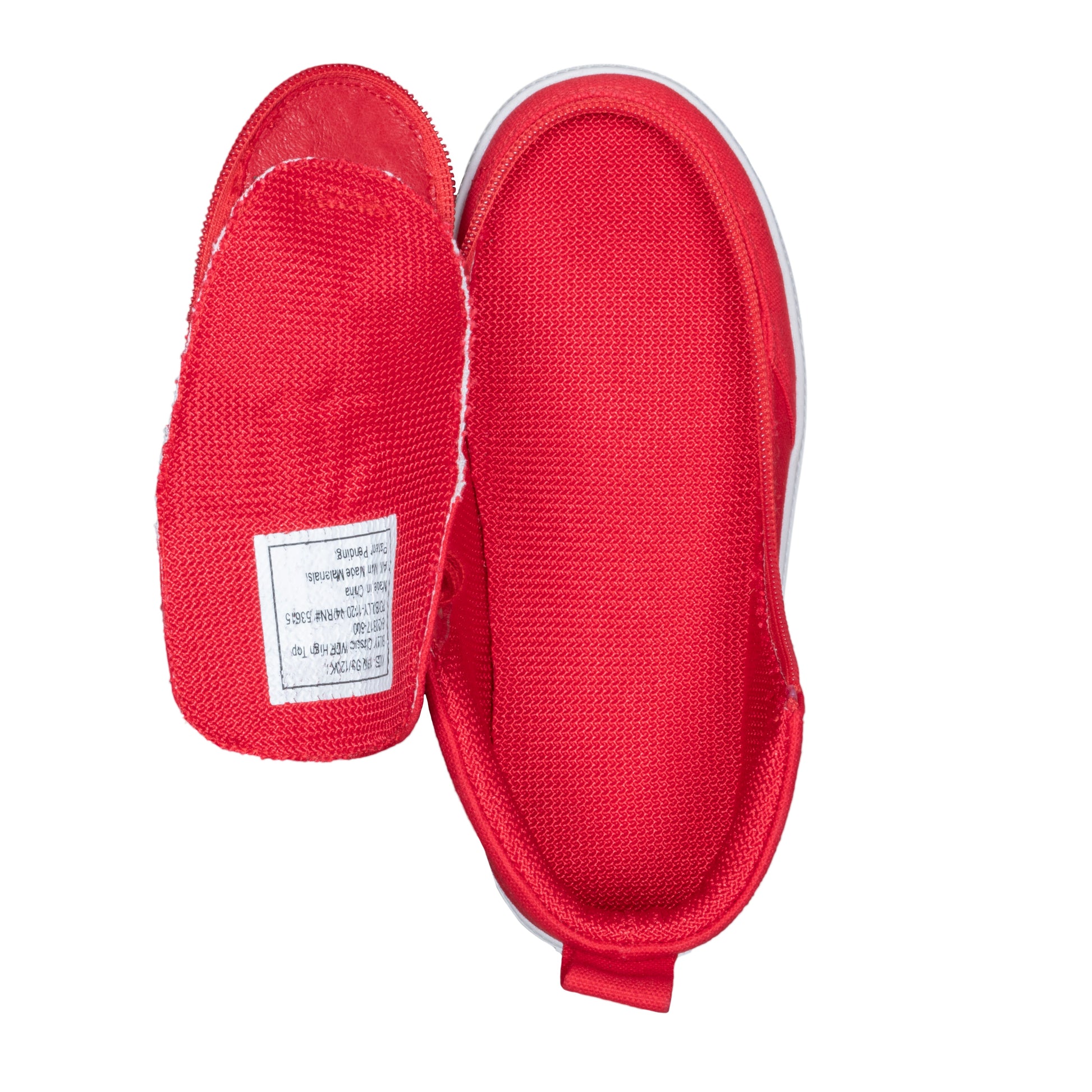 The Red BILLY Classic D|R High Top AFO-friendly shoes consist of three widths: Medium (MDR), Wide (WDR), and Extra-Wide (XDR). The laces on these shoes are functional for an adjustable fit. The thick knit polyester fabric upper lining adds durability for increased tear resistance. The full-wrap zipper closure allows for unobstructed fun and easy entry into the shoe. The insole board and outsole rubber compound helps withstand toe and heel striking. And the two removable insoles (3mm each) provides adjustable depth for custom orthotics.